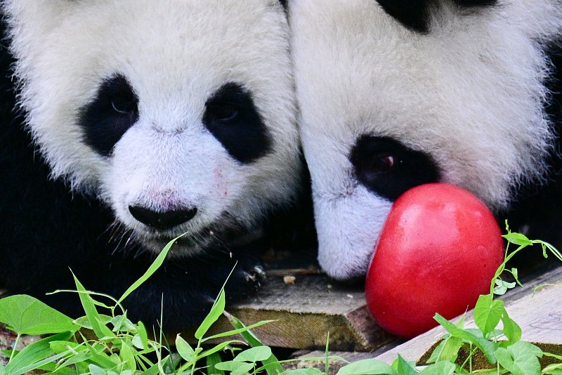 Die Berliner Pandas Leni und Lotti (1) haben zum Geburtstag eine besondere Köstlichkeit bekommen - nämlich Eismurmeln aus Rote-Bete- und Karottensaft. Die Zwillinge hätten neugierig daran geschleckt, eine Bambuskerze erklommen und ausgelassen miteinander gerangelt, teilte der Zoo mit. Die Pandabären waren vor genau einem Jahr zur Welt gekommen.