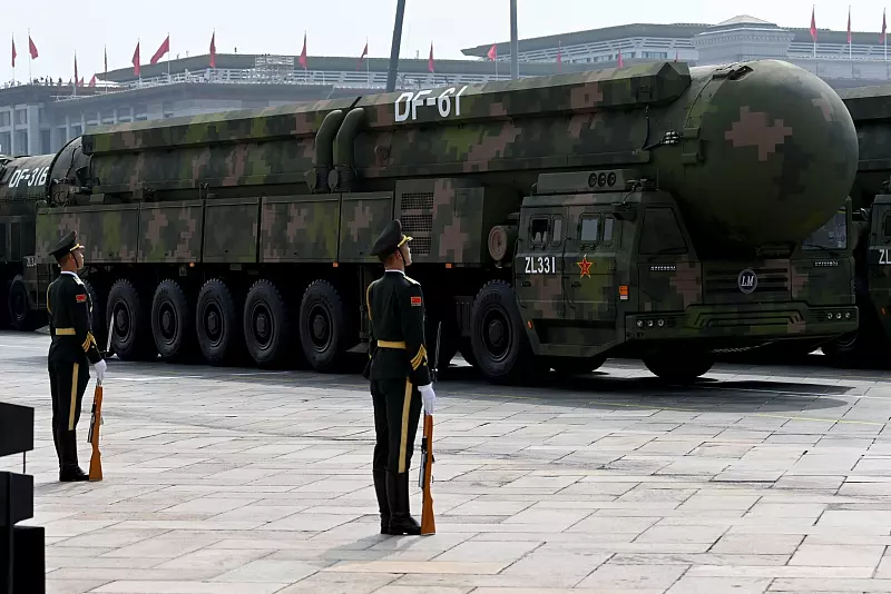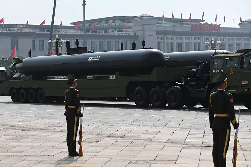 Außerdem zeigte Peking Hyper- und Überschallraketen. Ebenfalls aufgefahrene Interkontinentalraketen aus dem chinesischen Arsenal können auch Atomsprengköpfe tragen und Ziele in den USA und Europa erreichen.