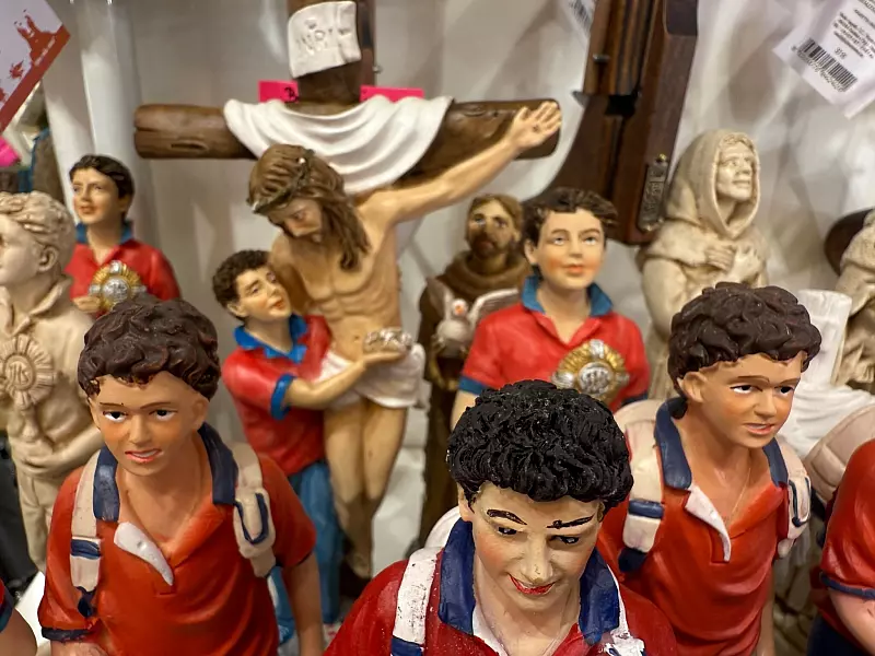 Was nichts daran ändert, dass viele in Assisi mit dem neuen Heiligen schon gutes Geld verdienen. In den Souvenirgeschäften ist so gut wie alles im Angebot: Jutebeutel, T-Shirts, Medaillons, Anhänger, Rosenkränze, sogar Kühlschrankmagneten. Der Preis für eine Figur in Standardgröße: um die 45 Euro. Auf Bestellung kann man sich Carlo Acutis aber auch in Lebensgröße schnitzen lassen, für 5.000 Euro.