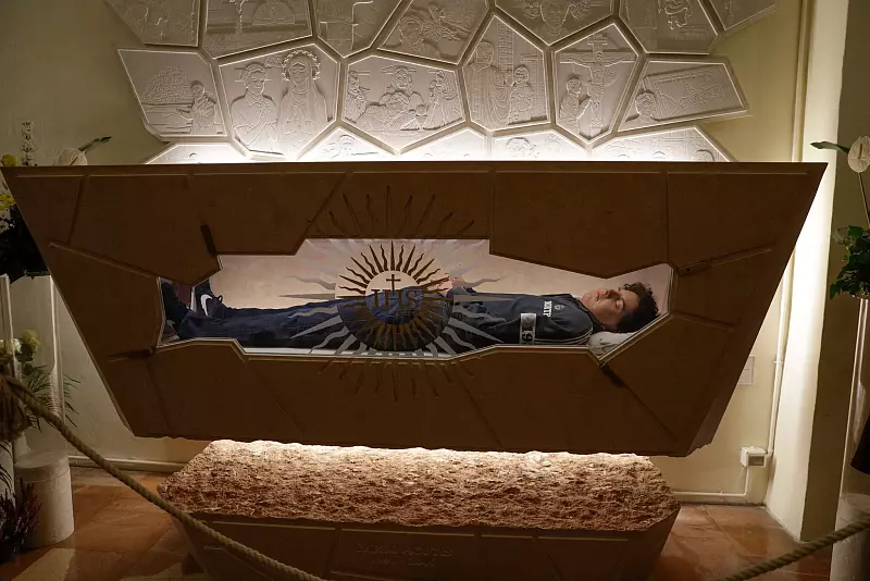 Seine sterblichen Überreste liegen nun in einem Sarkophag mit Glasscheibe, durch die man hineinschauen kann. Der tote Junge trägt Jeans und Turnschuhe. In die Hände hat man ihm einen Rosenkranz gelegt. Gesicht und Hände wurden mit Silikon nachmodelliert. Gegenüber steht eine steinerne Bank für Besucher, die länger bleiben wollen. Aber die meisten gehen doch eher schnell vorbei. Fotografieren ist verboten.