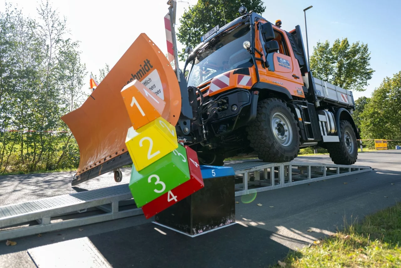 «Die Fahrer müssen mit einem Unimog und vorne montiertem Räumschild möglichst zügig und fehlerfrei den großen Parcours vorwärts und rückwärts bewältigen.» Es gehe um «Geschicklichkeit, Präzision, Sicherheit und Schnelligkeit». So ging es zum Beispiel über eine Rampe, es mussten präzise Gegenstände verschoben werden – und es ging rückwärts durch eine enge Gasse.