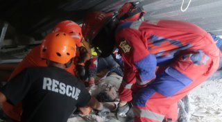 Rettungskräfte suchten weiter nach Verschütteten. Zuvor hatte Muhari betont, dass sechs Personen lebend unter den Trümmern entdeckt worden seien. Sie wurden unter anderem mit Wärmedetektoren aufgespürt und durch kleine Öffnungen mit Nahrung und Wasser versorgt. Ihre Bergung sei wegen der Betonmassen aber sehr schwierig.