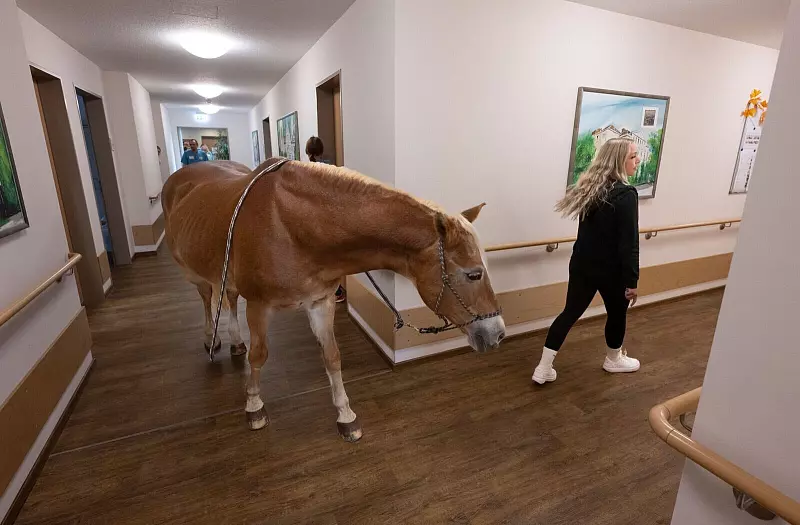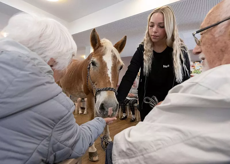 Vorsichtig setzt Wega ihre Hufe auf das dunkle Laminat. Schritt für Schritt wagt sich die Haflinger-Stute in das Foyer des Pflegeheims in Bückeburg im niedersächsischen Landkreis Schaumburg vor. Das Klackern der Hufeisen führt zu ersten neugierigen Blicken. «Kommt ruhig näher heran, sie ist ganz vorsichtig», ruft Nele Plaßmeier den noch etwas zurückhaltenden Bewohnerinnen und Bewohnern zu, während sie ihr Pferd nur locker am Strick führt.