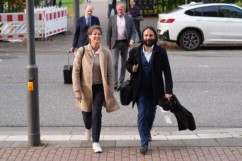 Unternehmerin Block (links) und ihr Verteidiger Bott (rechts) laufen zum Landgericht. - © Marcus Brandt/dpa
