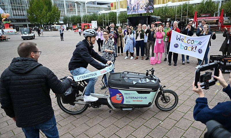 10.700 Kilometer, sieben Reifenpannen und zwei Unfälle liegen hinter Lennart Schaefer. Aber als der 27-jährige Hamburger mit seinem Lastenrad auf der Frankfurter Buchmesse eintrifft, ist seine wertvolle Fracht unbeschädigt: acht Bücher. Mit ihnen radelte er sieben Monate lang von der Leipziger Buchmesse zur Frankfurter Buchmesse – mit Umwegen durch alle 16 Bundesländer, wo er in Buchhandlungen und Schulen Station machte.