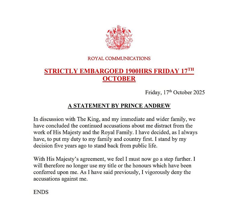 Nach neuen mutmaßlichen Beweisen für die wohl tiefe Freundschaft zwischen Andrew und Epstein und kurz vor der Veröffentlichung der Memoiren des bekanntesten Opfers hatte der Prinz am Freitagabend seine verbliebenen Titel und Ehrungen aufgegeben. «Nach Diskussionen» mit dem König und seiner Familie, steht in der offiziellen Mitteilung. Der Tenor der britischen Medien ist aber klar: Andrew musste verzichten - sonst hätte der König den Sturz angeordnet.