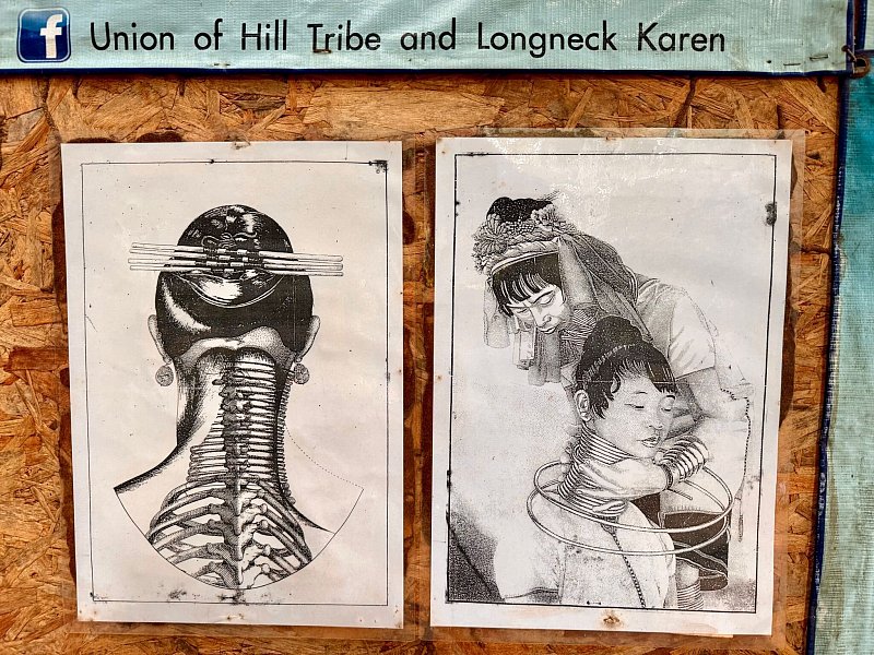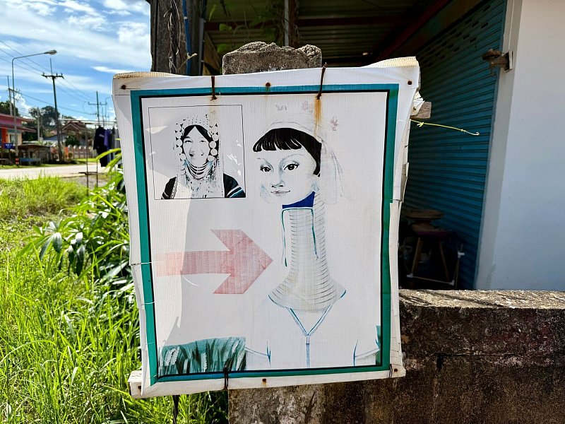 Am Rand der Berge nördlich von Chiang Rai sitzen Frauen vor ihren Hütten und weben flink bunte Schals. An einer Bambusstange wehen die fertigen Handarbeiten im Wind. Sie dienen als eine Art «Tauschgeschäft»: Touristen kaufen die Souvenirs und dürfen im Gegenzug Fotos von den «Long Neck Karen» machen, deren Hälse durch Dutzende spiralförmige Messingringe in die Länge gestreckt zu sein scheinen. «Giraffenfrauen» werden sie im allgemeinen Sprachgebrauch oft genannt, auch wenn der Begriff als Beleidigung gilt.
