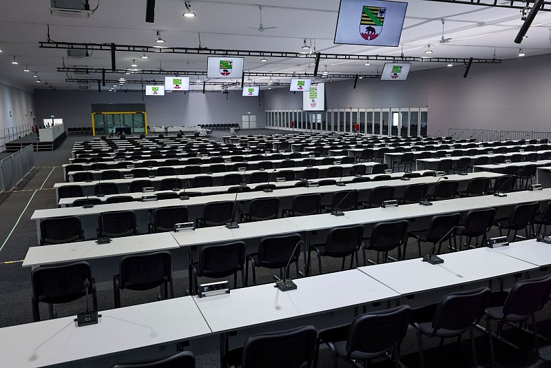 Für den Prozess ist ein spezielles Interims-Gerichtsgebäude in Leichtbauweise errichtet worden – allen Betroffenen soll so Gelegenheit gegeben werden, das Verfahren persönlich zu verfolgen. Die Dimension ist riesig: Der Verhandlungssaal ist 65 Meter lang und 30 Meter breit. Er bietet Platz für etwa 450 Nebenkläger und Nebenklagevertreter und hat 200 Plätze für Zuschauer und Medienvertreter. Das Land Sachsen-Anhalt mietet das Gebäude für die Prozessdauer und rechnet mit Kosten im mittleren einstelligen Millionenbereich.