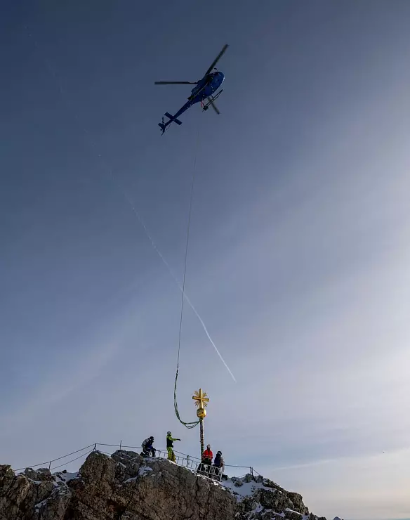 Wenn die ersten Skifahrer am Gipfel aus der Gondel der Zugspitzbahn steigen, soll das goldene Kreuz per Helikopter dort oben in 2.962 Metern Höhe einfliegen. Zuvor bringt ein Lastwagen das 4,88 Meter große und 300 Kilogramm schwere Stück aus der Werkstatt der Kunstschmiedin Andrea Würzinger in Eschenlohe zum Startplatz am Fuß der Zugspitze. Gut zwei Wochen hat Würzinger daran gearbeitet - eine echte Herausforderung, auch wegen der Größe des Kreuzes, sagt sie.