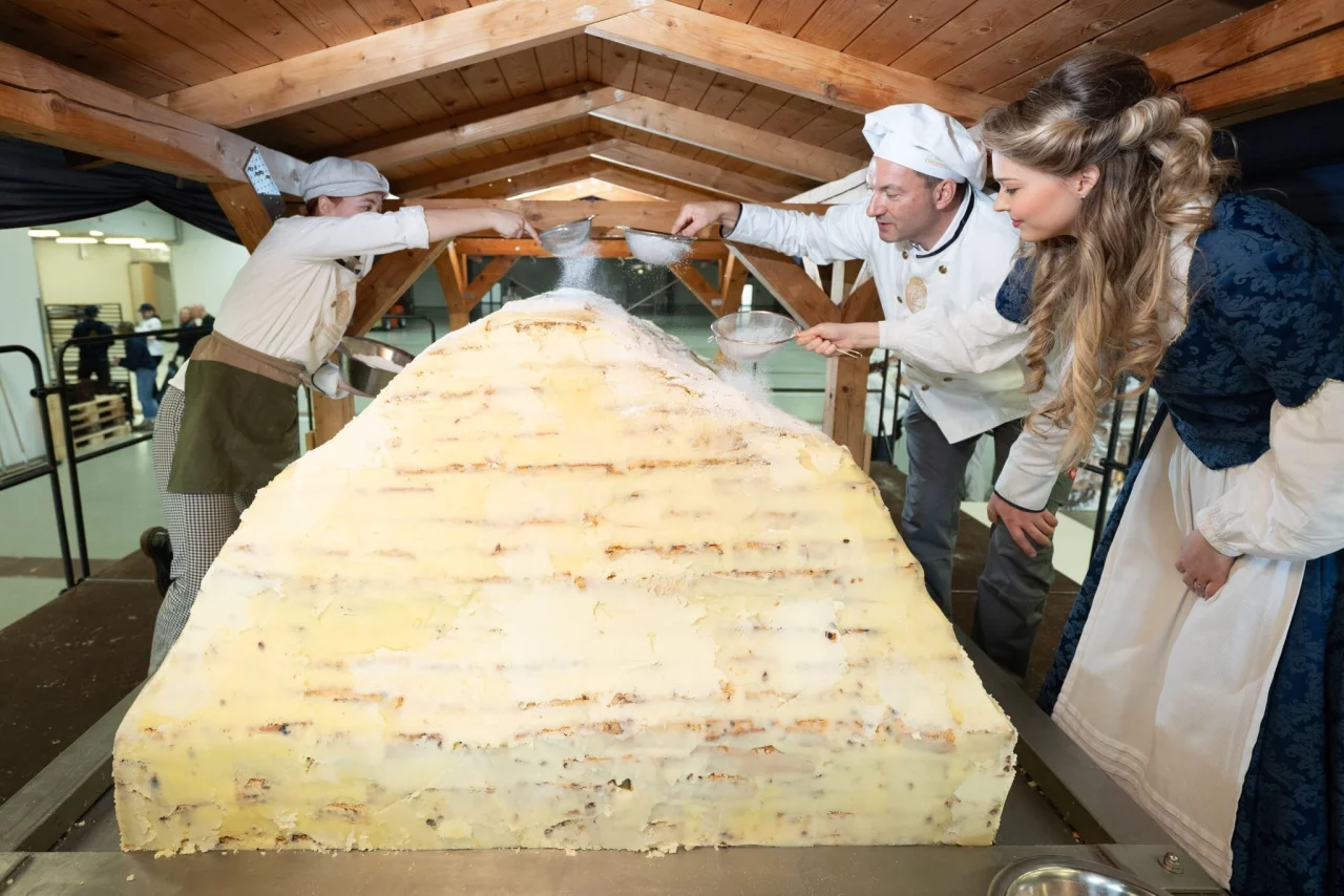 Die Dresdner Stollenbäcker haben den XXL-Striezel für das diesjährige Stollenfest zusammengesetzt. Aus mehr als 3.300 Teilen und mit reichlich Butter, Zucker und Puderzucker entstand der Stollengigant. 35 Bäckerinnen und Bäcker sowie zahlreiche Helfer benötigten rund sieben Stunden, um das süße Backwerk zusammenzusetzen, wie der Schutzverband Dresdner Stollen mitteilte.