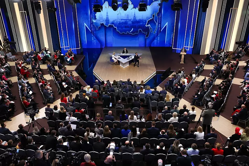 Im Saal des Veranstaltungszentrums Gostinny Dwor in Moskau versuchten die Zuschauer wie üblich mit Rufen und Plakaten die Aufmerksamkeit von Putins Pressesprecher Dmitri Peskow zu erlangen und ihre Fragen loszuwerden. Ein junger Mann machte seiner Freundin, die am Bildschirm zusah, einen Heiratsantrag.