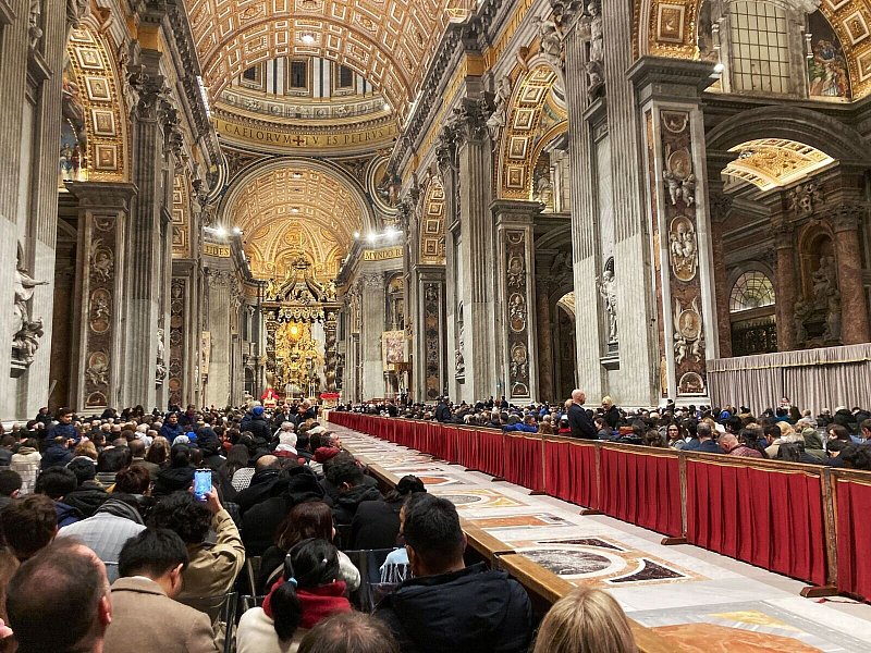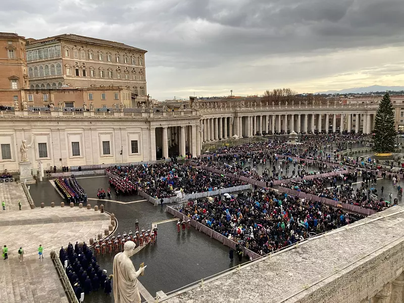 Auf dem Petersplatz verfolgten Tausende bei strömendem Regen die auf Bildschirmen nach draußen übertragene Messe. Der Papst hatte sie vor Beginn begrüßt, ihnen frohe Weihnachten gewünscht und sich bedankt, dass trotz des schlechten Wetters so viele gekommen seien. Der Petersdom sei zwar groß, biete aber nicht genug Platz für alle. Bevor er sich vor der Messe nochmals kurz zurückzog, segnete er die Gläubigen, die unter Regenschirmen ausharrten.