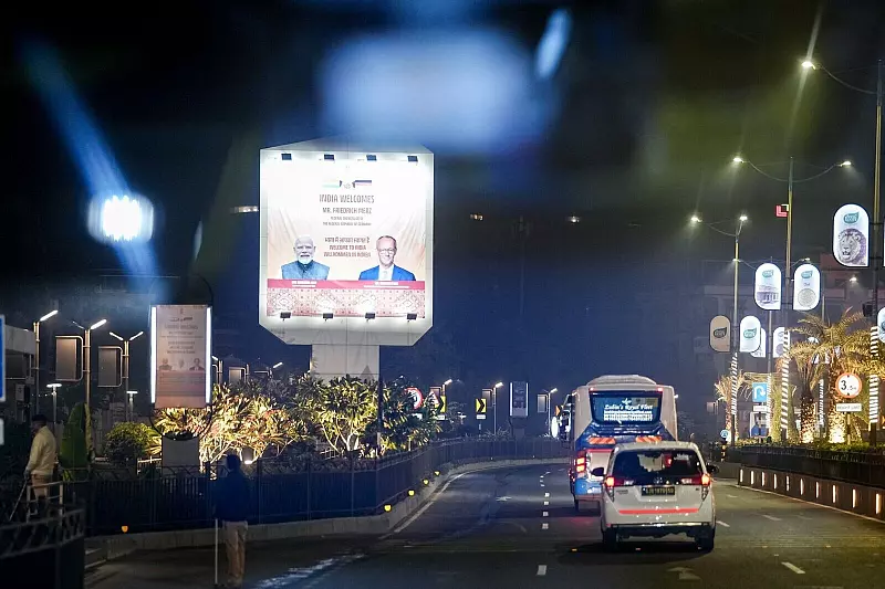 Mit großen Schildern heißt Modi seinen Gast willkommen. - © Kay Nietfeld/dpa