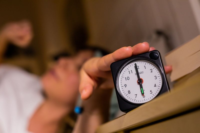 Eine Frau schaltet vom Bett aus einen auf sechs Uhr gestellten Wecker aus. (© Christoph Soeder/dpa/Illustration)