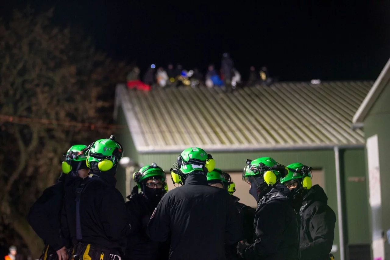 Aktivisten zündeten am Abend Feuerwerk auf dem Gelände. Mindestens zwei Raketen flogen dabei waagerecht in Richtung von Polizeiautos. Ansonsten blieb der Protest weiter friedlich. Die Polizei sei selbstverständlich weiter vor Ort, sagte eine Sprecherin. Man plane aber in der Nacht nicht, etwa gegen die Häuser vorzugehen. In diesen Häusern sowie in selbstgebauten Baumhäusern halten sich weiter Aktivisten auf.