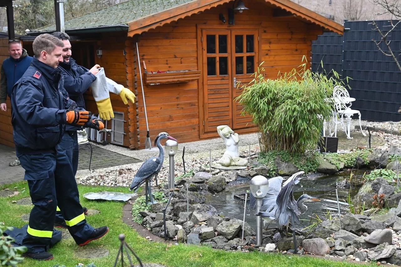 Der Ausblick auf eine reichhaltige Mahlzeit und einen vermeintlichen Artgenossen ist für einen Fischreiher trügerisch gewesen. Der elegante Vogel landete am Samstagmorgen in einem Wohngebiet in Dorsten im nördlichen Ruhrgebiet in einem Gartenteich mit Zierfischen, an dessen Rand auch eine Fischreiherstatue als Dekoration stand. Fatal war für den echten Reiher, dass kaum sichtbare Angelschnüre zum Schutz der Teichbewohner gespannt waren. So verhedderte sich der Reiher derart, dass die Hausbewohner und Nachbarn die Freiwillige Feuerwehr Dorsten alarmierten.