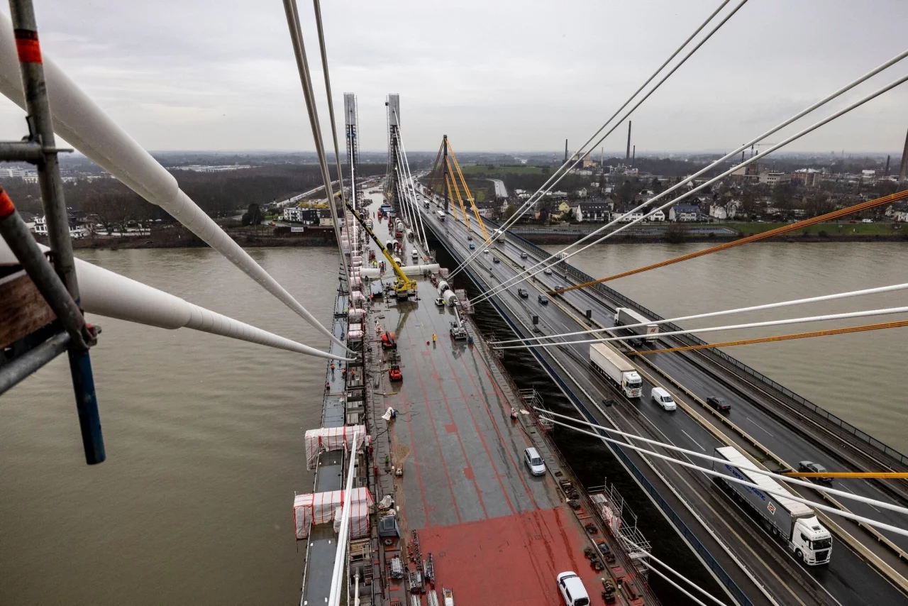 Mit einer symbolischen «letzten Schweißnaht» sind am Dienstag die beiden Hälften der A40-Rheinbrücke in Duisburg vollständig verbunden worden. Nach der «Brückenhochzeit» wird die Fahrbahn eingerichtet und markiert, ein Geh- und Radweg eingerichtet und mit Lärmschutzwänden abgetrennt. Ende 2023 soll das Brückenbauwerk eingeweiht und vorübergehend auf drei Fahrstreifen pro Richtung für den Verkehr freigegeben werden, plant das öffentliche Straßenbauunternehmen Deges. Danach folgt der Bau einer zweiten parallelen Brücke, die 2026 fertig werden soll.