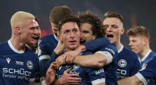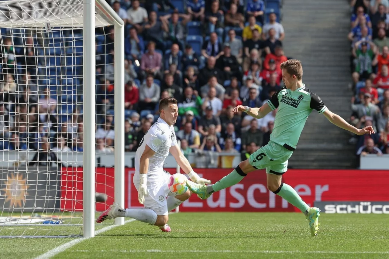 Angetrieben von den Fans im voll besetzten Stadion erzwang Stürmer-Oldie Klos für die Arminia den Ausgleich im Nachschuss (22.). Mit einem Handelfmeter brachte Teuchert sein Team mit dem 12. Saisontreffer aber erneut in Führung (42.), ehe Schaub mit dem 3:1 für die Entscheidung sorgte (56.). In der Schlussphase sah Hannovers Yannik Lührs noch die Rote Karte (87.).