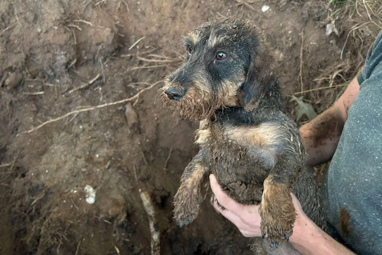Wo genau sich der Rüde in dem verzweigten Bau befand, war aber zunächst unklar. Mit einem Minibagger wurde ein Teil des Böschungsbereichs abgetragen, dann kamen Spaten und Schüppen zum Einsatz. Der Dackel bellte ab und zu und gab damit Hinweise auf seine Position. Nach zwei Stunden hastete zuerst das pflanzenfressende Nagetier aus seinem Bau. Dann kam Skyb zum Vorschein - wohlauf und ohne sichtbare Verletzungen.