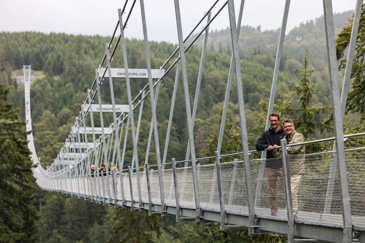 Erster Höhepunkt ihrer Tour vom nordhessischen Willingen ins sauerländische Winterberg war die längste Hängebrücke Deutschlands, der «Skywalk»: bis zu 100 Meter hoch, nur 1,30 Meter schmal und 665 Meter lang. «Zittern Ihre Knie, Herr Wüst?», fragt eine Reporterin. «Noch nicht, aber fragen Sie mich später noch mal», gibt er zurück.
