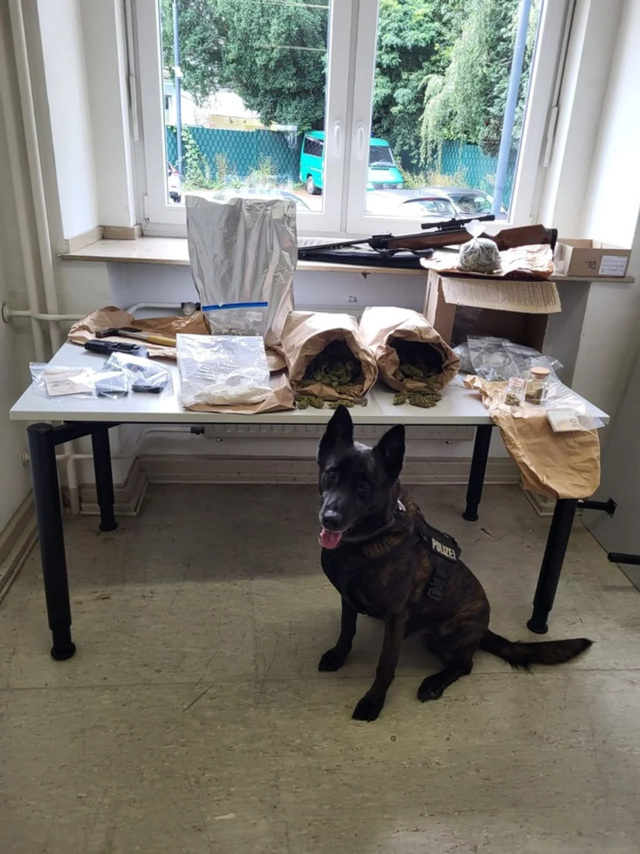 Mit der Hilfe von Drogen-Spürhund Cash hat die Polizei in Dormagen und Marl nach längeren Ermittlungen eine größere Menge Drogen sichergestellt. Die Beamten vollstreckten Durchsuchungsbeschlüsse gegen fünf Männer im Alter von 33 bis 48 Jahren und durchsuchten vier Wohnungen in Dormagen und Marl, wie die Polizei am Freitag mitteilte. Vor Ort fanden Spürnase Cash und die Ermittler neben Betäubungsmitteln mit einem Verkaufswert von etwa 70.000 Euro auch Waffen und weitere Beweismittel.