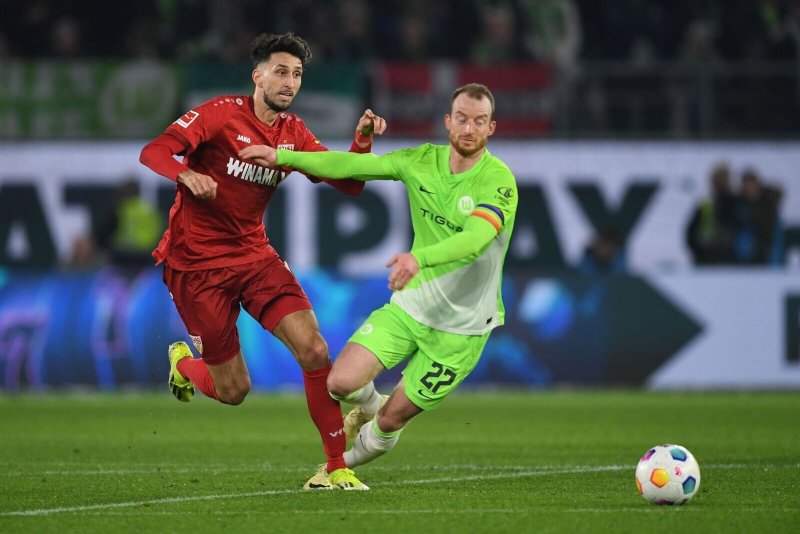 Stuttgarts Atakan Karazor (l) spielt gegen Wolfsburgs Maximilian Arnold. (© Swen Pförtner/dpa)