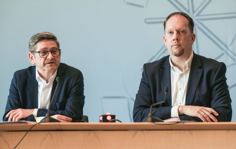 Marco Schmitz (r) und Josef Neumann (l) sprechen im Landtag auf einer Pressekonferenz. - © Oliver Berg/dpa