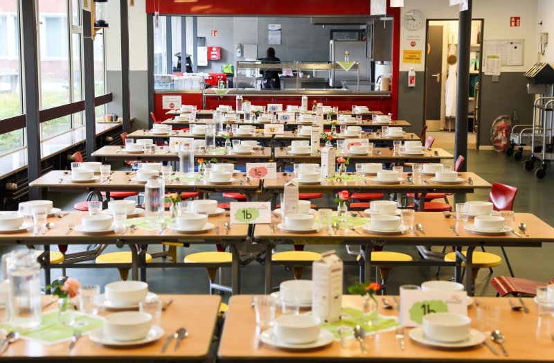Tische in der Mensa einer Grundschule. - © Christian Charisius/dpa