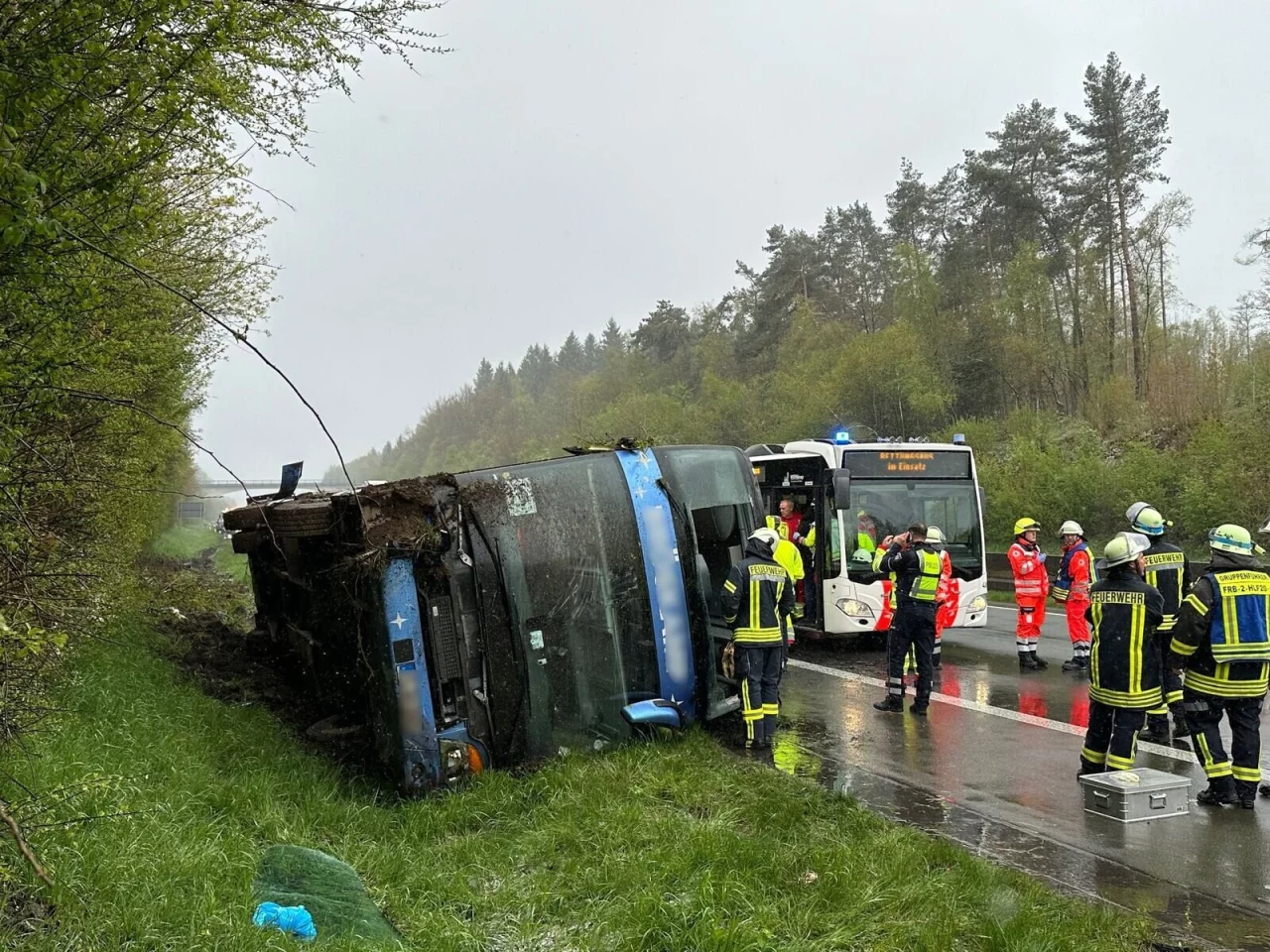 Der Bus mit 73 Menschen an Bord war am frühen Sonntagmorgen auf der Autobahn 45 bei dem Ort Wenden plötzlich umgestürzt, wie es hieß. Er blieb auf der Seitenspur und einem Grünstreifen liegen. Die Unfallursache war zunächst unklar, wie ein Polizeisprecher am Sonntag sagte. Ein Unfallaufnahmeteam führte Ermittlungen vor Ort durch.