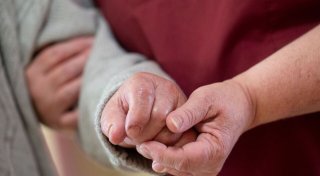 Ein Pfleger hält in einem Pflegeheim die Hand einer Bewohnerin. - © Oliver Berg/dpa