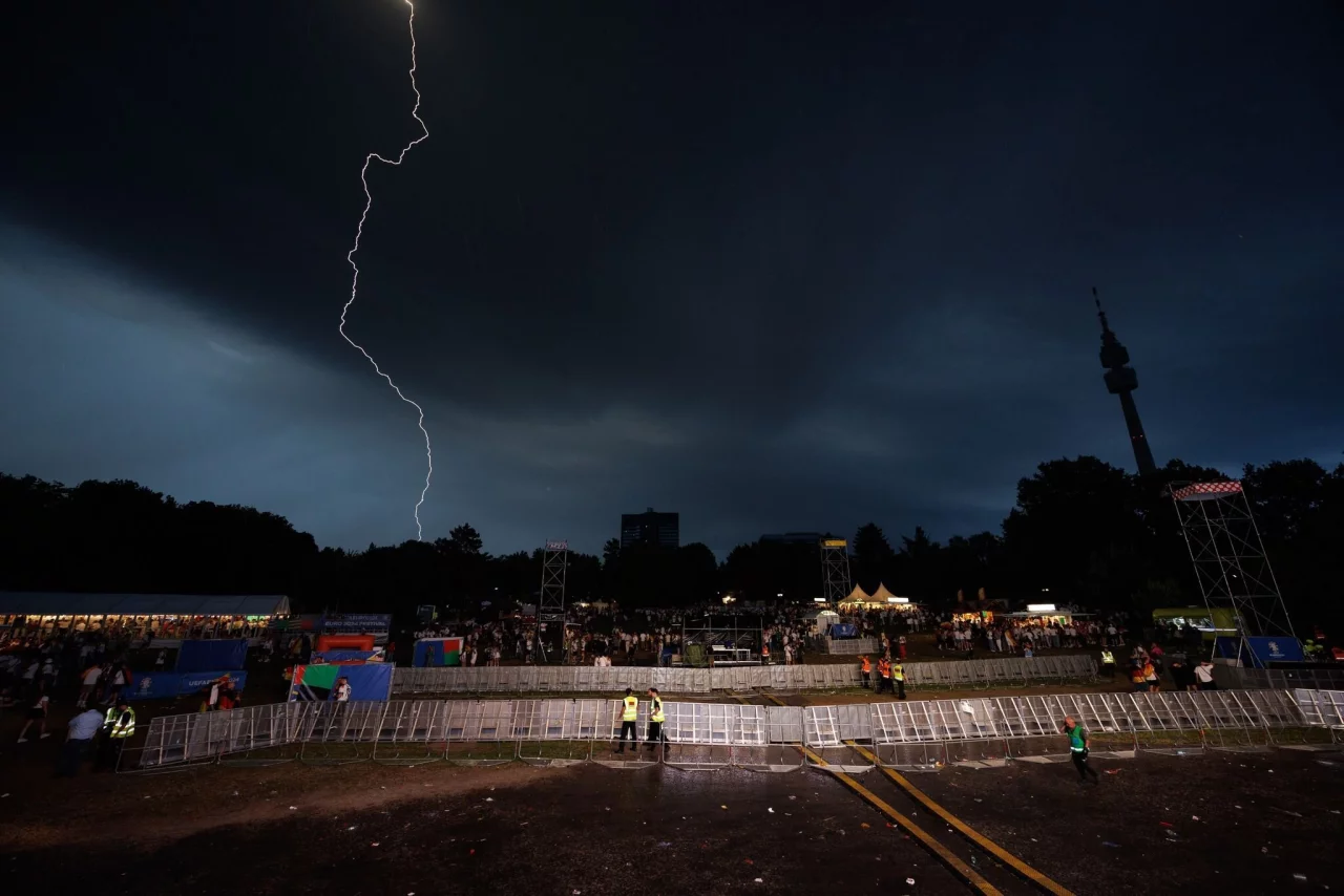 «Aufgrund eines aufkommenden Unwetters wird die Veranstaltung beendet» - tönt es stattdessen schon eine halbe Stunde nach Anstoß durch die Lautsprecher. Kurz darauf strömen Tausende im einsetzenden Regen zu den Ausgängen. Schon als im nahe gelegenen Stadion das Spiel angepfiffen wurde, hatte sich der Himmel über der Stadt immer weiter verfinstert. Dann schlagen ganz in der Nähe Blitze ein, es donnert immer wieder kräftig.