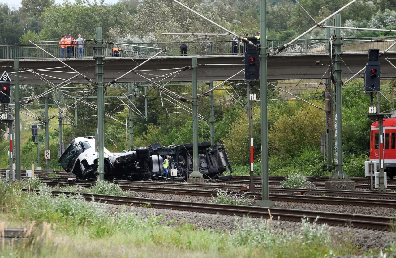 An einem Bahnhof in Kerpen westlich von Köln war am Freitagmittag ein Lastwagen von einer Brücke auf die darunter liegenden Gleise gestürzt. Züge wurden von dem Lkw glücklicherweise nicht beschädigt. Auf der wichtigen Bahnstrecke fahren neben S-Bahnen und Regionalzügen auch ICE- und Eurostar-Züge.