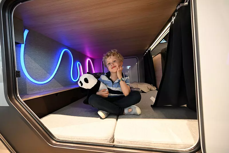 Drinnen entsteht Platz für ein Doppelbett durch eine aufblasbare Verlängerung am Heck. Und unter den Elternschlafplätzen gibt es eine Art Schlafhöhle für Kinder mit zwei Matratzen und einer Leuchtschlange an der Wand.