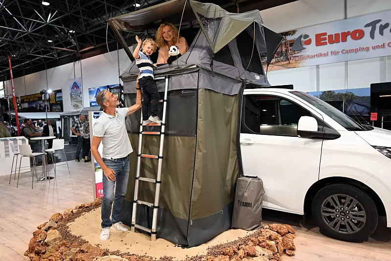 Auch wer ein Faible fürs Zelten auf Autodächern hat, kommt bei der Messe auf seine Kosten. So präsentiert etwa die Firma Fiamma ein Update ihres Dachzelts «Moonlight», in dem bis zu drei Personen schlafen können. Installiert werden kann es auf Campingbussen, SUV und überhaupt allen Fahrzeugen, die eine Dachreling haben. Knapp 2.500 Euro kostet die Drei-Mann-Variante.
