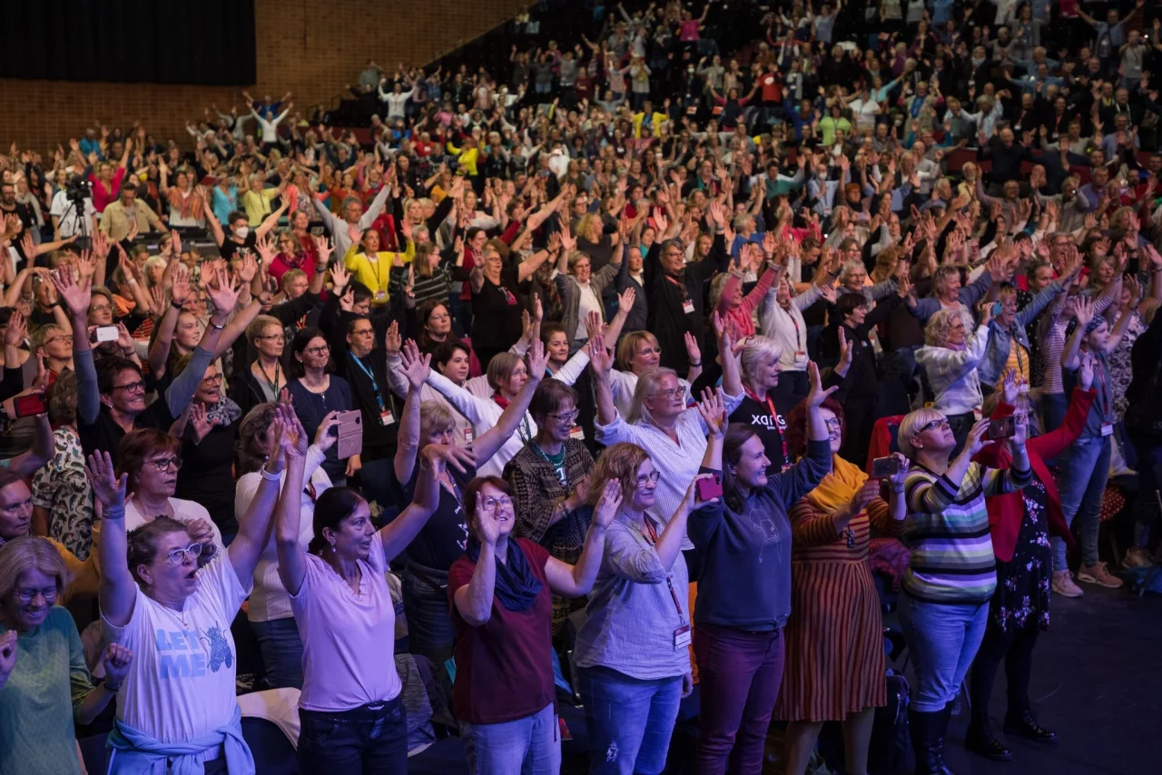 Mit gemeinsamem Gesang hat auf dem Essener Kennedy-Platz der ökumenische Gospelkirchentag 2024 begonnen. «Wir kommen mit 5.000 Sängerinnen und Sängern aus 24 Nationen», rief Gospel-Kirchentags-Pastor Matthias Kleiböhmer am Freitagnachmittag bei der Begrüßung. Den Auftakt machte das Gospel-Ensembe «Rejoice» («Freue Dich») aus Langenberg. Trotz des zeitweise kräftigen Regens sangen und klatschten etliche Zuhörer mit.