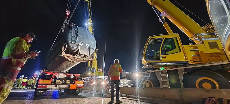 Mehr als acht Stunden dauerten die Bergung des Lastwagens und der anschließende Abtransport des Containers den Angaben zufolge. Da dieser unbeschädigt geblieben war, ging von der Substanz darin demnach keine unmittelbare Gefahr aus. Die Autobahn wurde erst nach Mitternacht wieder für den Verkehr freigegeben. Zur Unfallursache sowie zur Höhe des Schadens machte die Feuerwehr zunächst keine Angaben.