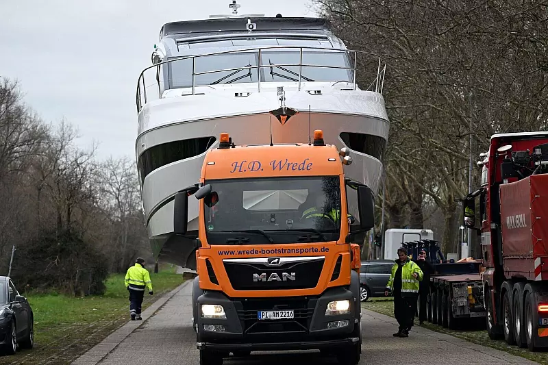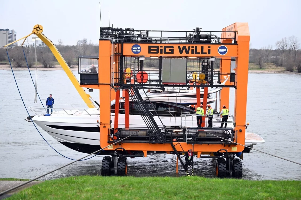 Ein Spezialkran hat in Düsseldorf Luxusjachten aus dem Rhein gehoben, die ab dem 18. Januar bei der Boots- und Wassersportmesse «Boot» ausgestellt werden. Als Erstes hob Schiffskran «Big Willi» ein 40 Tonnen schweres Boot der britischen Princess Werft aus dem Wasser, das eigenständig nach Düsseldorf gefahren war. Ein Tieflader brachte das Schiff dann auf das Messegelände.