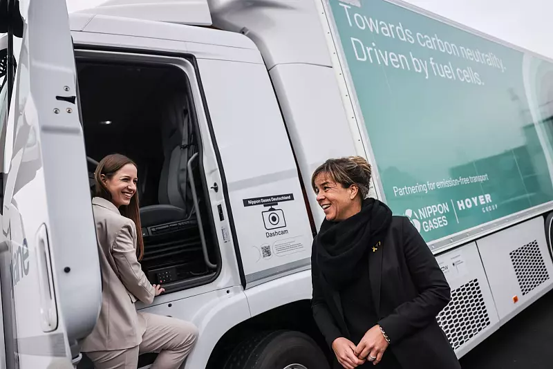 Anlass war die offizielle Übergabe eines Brennstoffzellen-Mietfahrzeugs an die Spedition Hoyer. Der Lastwagen soll für den Industriegase-Hersteller Nippon Gases sogenanntes Trockeneis transportieren. Dabei handelt es sich um gefrorenes Kohlendioxid, das vor allem zu Kühlzwecken etwa in der Lebensmittelindustrie und Pharmazie verwendet wird. Die Anschaffung des Lastwagens wurde mit Bundesmitteln gefördert.