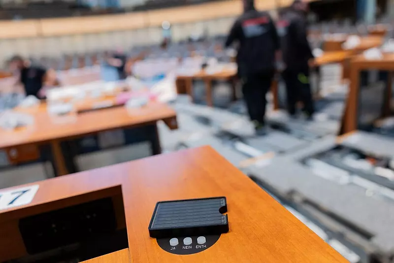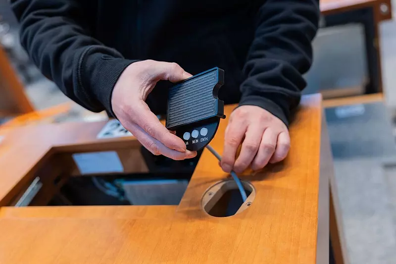 Die Abstimmungsanlagen werden in bereits vorhandenen Löchern in den Abgeordnetenpulten eingepasst, die bislang nicht genutzt wurden und abgedeckt waren. In einem zweiten Loch stecken die Mikrofone, die aktuell auch ausgetauscht werden. Bis zur ersten Plenarsitzung des Jahres am 29. Januar soll alles fertig sein.