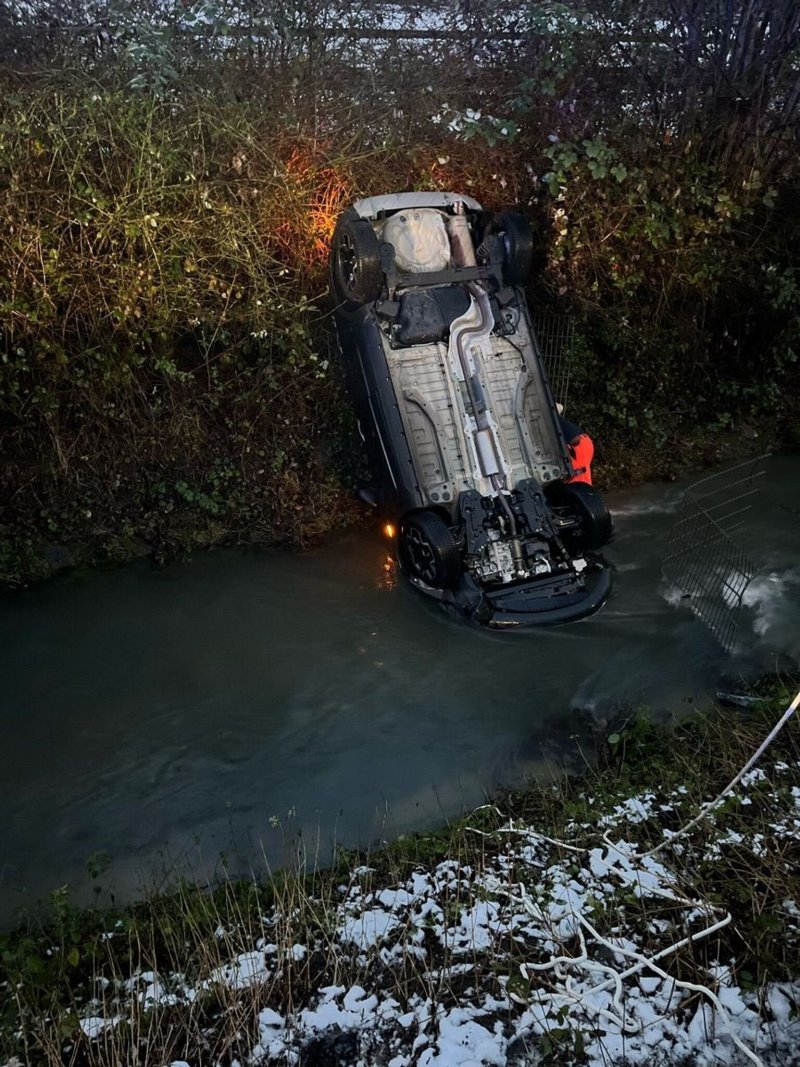 Das Auto durchbrach zwei Zäune, überschlug sich und landete auf dem Dach in einem Bach. Die Feuerwehr barg die 78-Jährige aus ihrem Auto, ein Rettungswagen brachte sie in ein Krankenhaus.