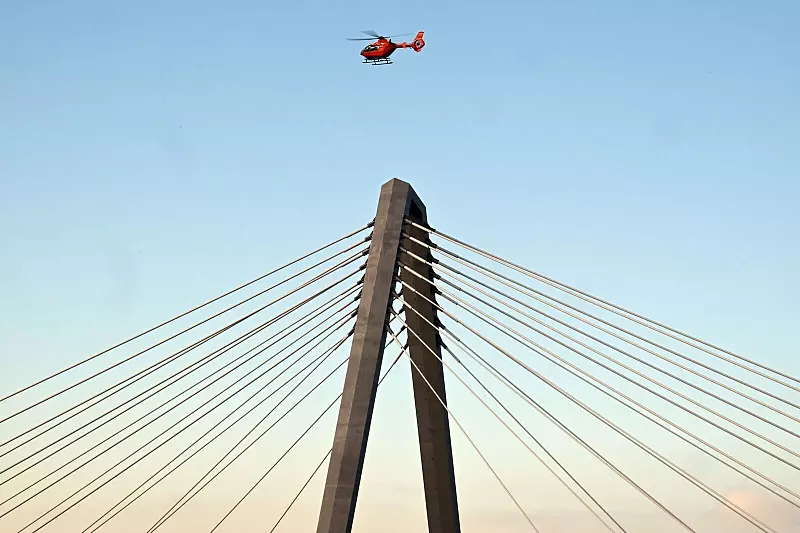 Ein Feuerwehrhubschrauber überflog später die Pylonen der Brücke, um die Eisplatten herunter zu wehen. Dies gelang jedoch nur teilweise, sodass die Entfernung per Hand nötig wurde - bis zu einer Höhe von 55 Metern. Dafür wurde ein Hubsteiger genutzt. Das ist eine Arbeitsplattform, die per hydraulischem oder elektromechanischen Antrieb in die Höhe gehoben wird.