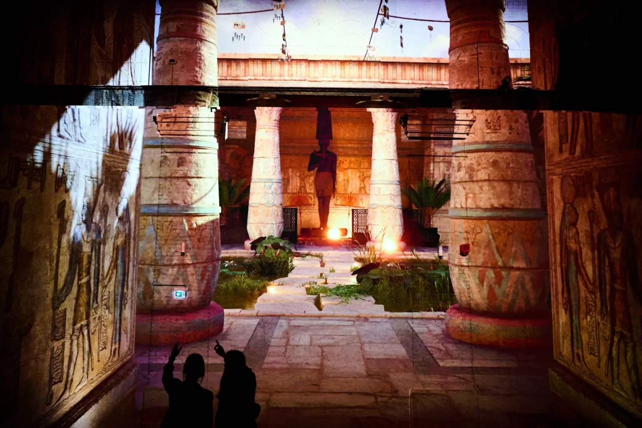 Auch die Sphinx oder Tempelanlagen lassen ab Freitag (24. Januar) in aufwendigen 3D-Rekonstruktionen die über 3.000 Jahre lang existierende Zivilisation des Alten Ägypten zum Greifen nah erscheinen. Wie der Direktor des Phoenix des Lumières, Andreas Richter, schilderte, sind modernste Technik, rund 100 Projektoren und 28 Lautsprecher im Einsatz. Ein Soundtrack wurde zusammengestellt.