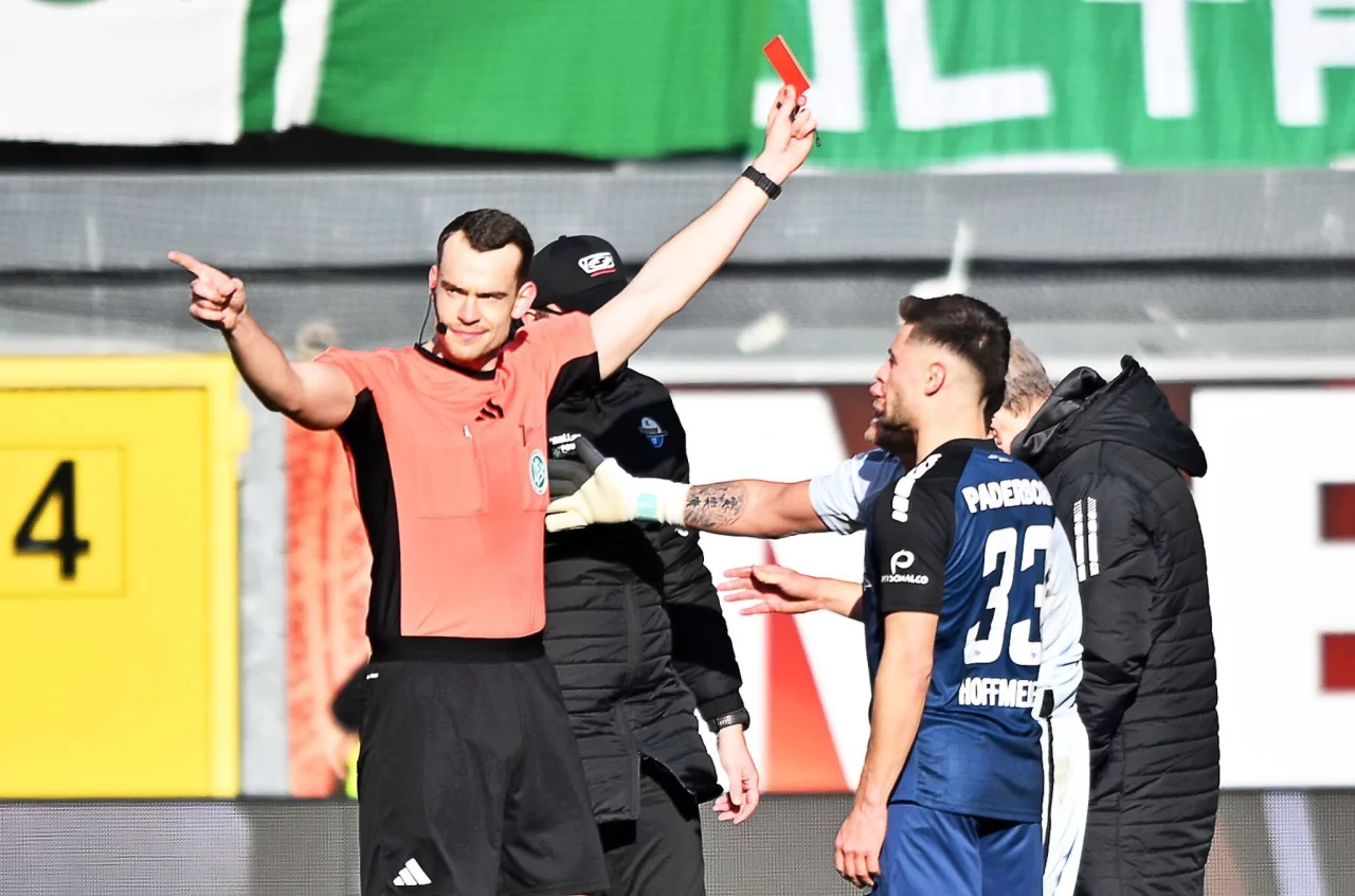 Für die auf vier Positionen neu formierte Fürther Elf begann die Partie optimal. Erst wurde ein Paderborner Abseitstreffer nicht anerkannt, dann gelang Torjäger Hrgota mit einem Freistoß das 1:0 und kurz darauf musste der neue SCP-Torhüter Manuel Riemann die Partie nach einer Roten Karte vorzeitig beenden. Der Ex-Bochumer hatte Gäste-Stürmer Felix Klaus als letzter Mann umgerannt.