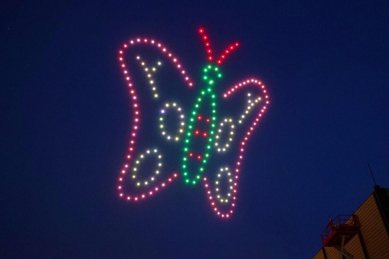 200 Drohnen zauberten auch einen Schmetterling an den Düsseldorfer Nachthimmel - © David Young/dpa Warten noch auf den Einsatz: Vor dem Messegebäude ist alles für die Drohenshow vorbereitet - © David Young/dpa