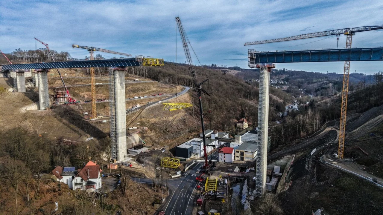 Wissing war ins Sauerland gekommen, um sich ein Bild vom Baustellenfortschritt zu machen: Seit mehreren Monaten wird der stählerne Überbau von beiden Seiten des Tales Stück für Stück über die Pfeiler geschoben. Nun sind beide Teile nur noch wenige Meter voneinander entfernt und sollen zeitnah miteinander verbunden werden, wie es am Dienstag von der Autobahn GmbH hieß. Der Brückenbauer spricht in so einem Fall von der «Stahlhochzeit».