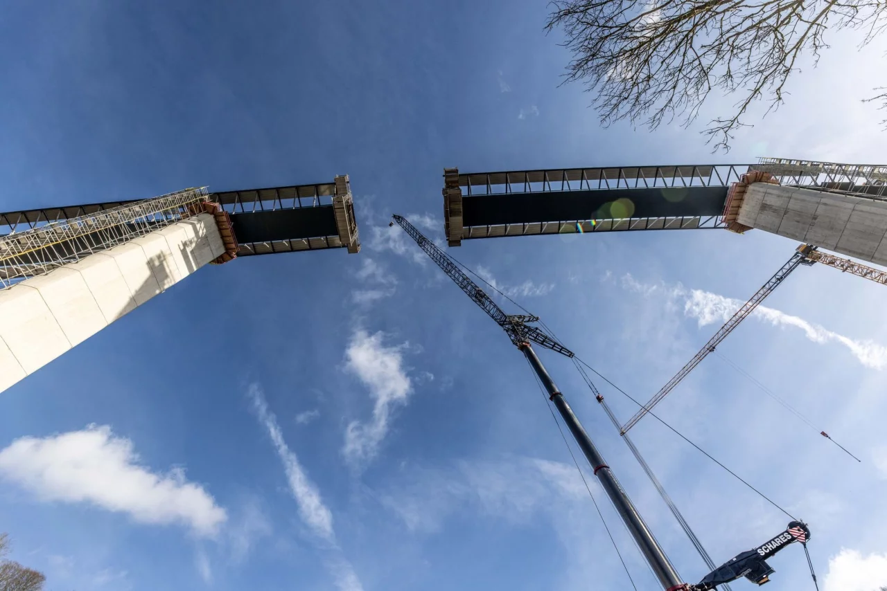Bereits am Dienstag hatte Verkehrsminister Volker Wissing die Baustelle besucht, um dem Lückenschluss, der als wichtiger Meilenstein im Brückenbau gilt, beizuwohnen. Die Stahlteile des ersten Brückenbauwerks, die seit Monaten Stück für Stück über die Pfeiler eingeschoben wurden, standen da allerdings noch mehrere Meter auseinander.
