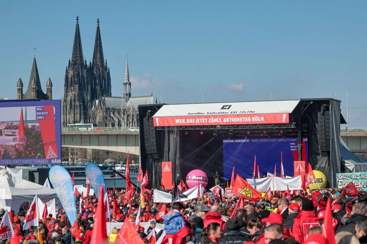 23.000 Menschen haben nach Gewerkschaftsangaben in Köln für den Erhalt sicherer Arbeitsplätzen in der Industrie demonstriert. Mit den Kundgebungen will die IG Metall den Druck auf die Koalitionsverhandlungen erhöhen. Gefordert wurde von der künftigen Bundesregierung eine Stärkung der Industrie für sichere Arbeitsplätze.