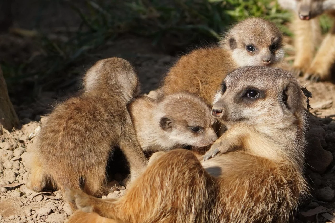 Vier Erdmännchen-Jungtiere sind im Klever Tiergarten geboren worden. Nachdem sie ihre ersten Lebenswochen in der schützenden Höhle verbracht haben, sind sie inzwischen auf der Anlage des Tiergartens unterwegs.