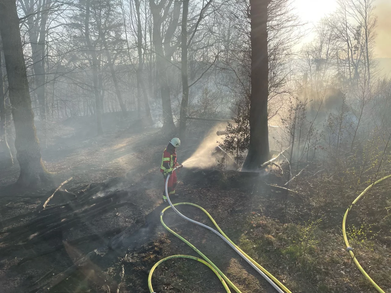 Rund 350 Kräfte sind bei einem Waldbrand im Rheinisch-Bergischen Kreis im Einsatz gewesen. Feuerwehrangaben zufolge brannte am Donnerstagabend eine Fläche von etwa 50.000 Quadratmeter bei Overath. Wegen der Windverhältnisse sowie der Hanglage und der Beschaffenheit des Bodens drohten die Flammen, sich auszubreiten. Daraufhin wurde laut Feuerwehr ein Pendelverkehr mit Tanklöschfahrzeugen eingerichtet. Auch ein Polizeihubschrauber samt Wasserbehälter war im Einsatz. Zur Schadenshöhe lagen zunächst keine Informationen vor. Die Polizei ermittelt zur Ursache.