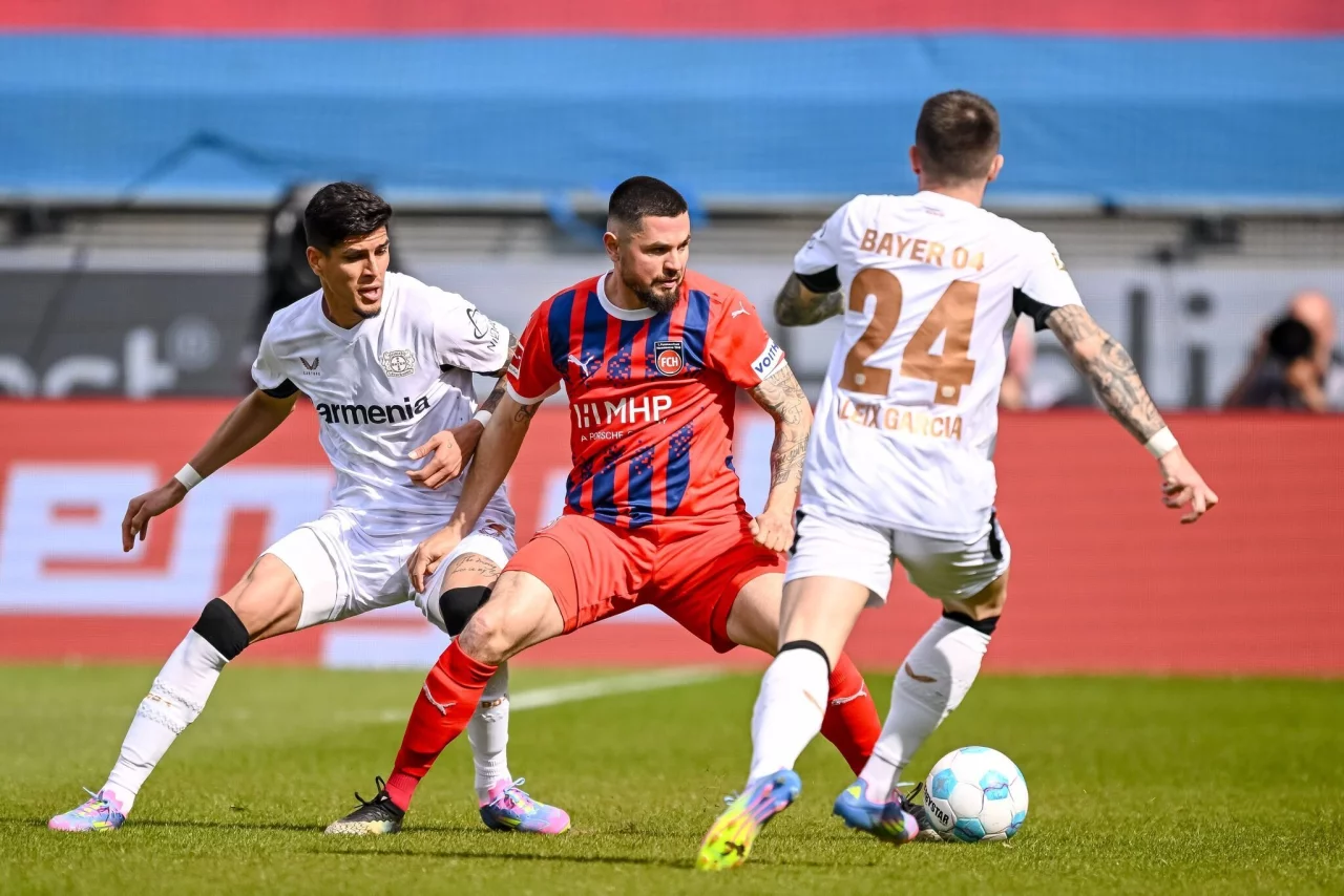 Der formstarke Gastgeber gab zu Beginn den Ton an. Und profitierte von wiederholten Patzern von Bayer-Führungsspieler Granit Xhaka. Nach elf Minuten hätte Adrian Beck die Führung für Heidenheim erzielen müssen, nachdem Marvin Pieringer dem Schweizer Xhaka den Ball abgenommen hatte. Doch Beck schoss knapp am langen Eck vorbei. Pieringer, Beck und Frans Krätzig bekamen in der ersten halben Stunde reichlich Raum für Offensivaktionen.